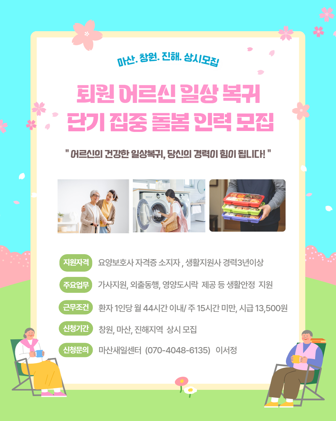 | 제목 | [마산. 창원. 진해] 퇴원 어르신 단기집중 돌봄 인력' 모집 | 등록일 | 2026-01-29 |