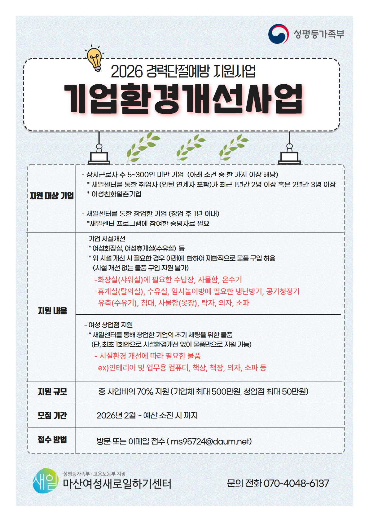 [2026 경력단절예방 지원사업] 환경개선사업 참여기업을 모집합니다. ▶신청방법 : 하단 첨부파일 클릭 → 참가신청서 다운로드 → 참가신청서 작성 후 방문 또는 이메일 접수(ms95724@daum.net) ▶기타 문의 : 070-4048-6137 (김영남) |