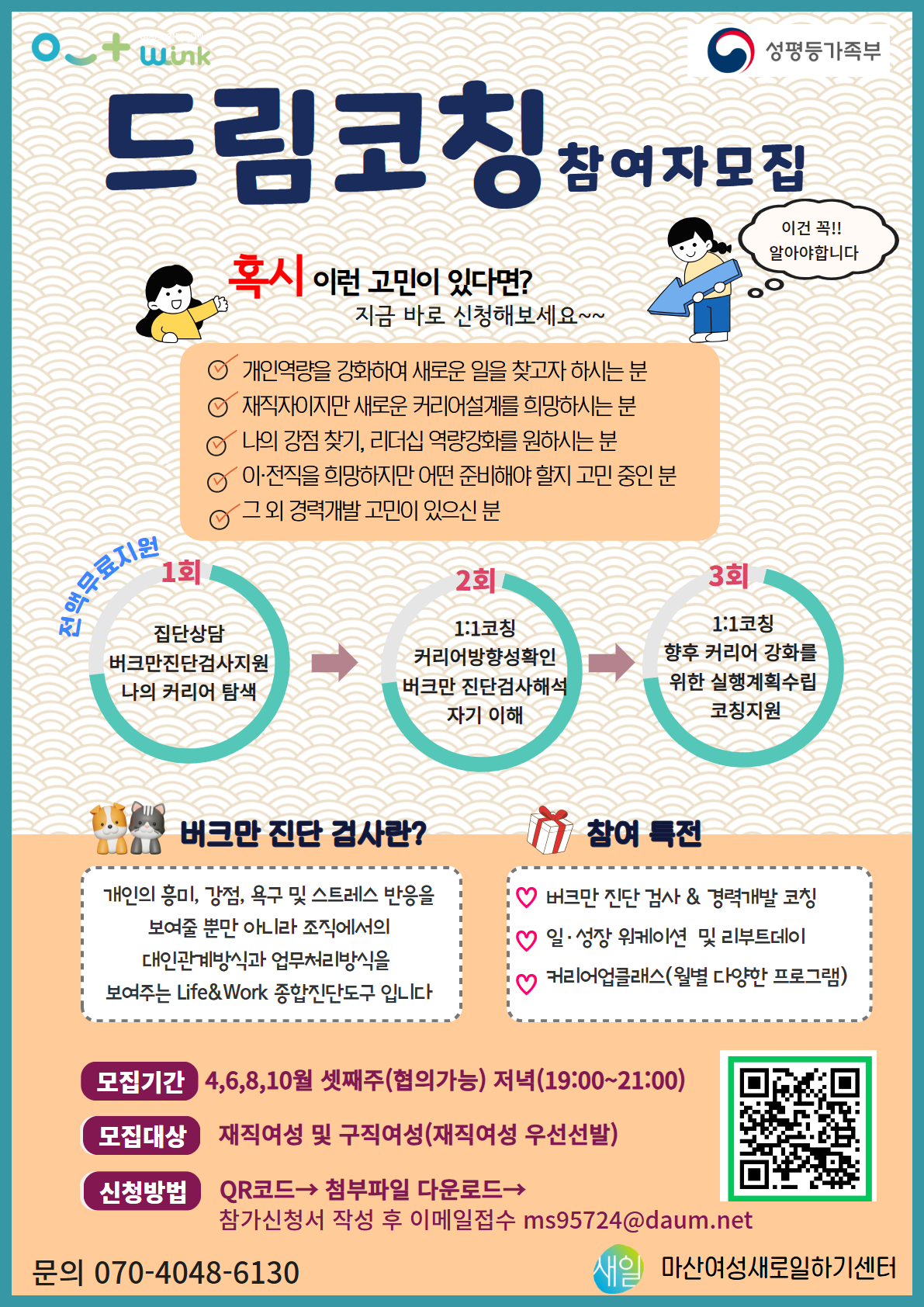 2026 경력단절예방지원사업 [드림코칭] 참여자 모집!! 경력개발 고민이 있는 여성 재직자 및 구직자 여러분 주목해 주세요!! 경력개발 상담이 필요한 여성예게 전문가와 심층상담 및 코칭을 통해서 로드맵 설계를 하고 발전 방향을 모색하여 고용유지를 적극 지원 코칭목적에 따라 적합한 진단도구 활용(예 : 버크만진로직업진단, DISC행동유형검사 등) [드림코칭] 에서 여러분의 고민을 함께 하도록 하겠습니다^^