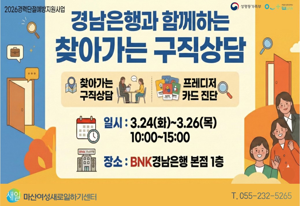 | 제목 | BNK경남은행과 함께 하는 찾아가는 구직상담 | 등록일 | 2026-03-05 |