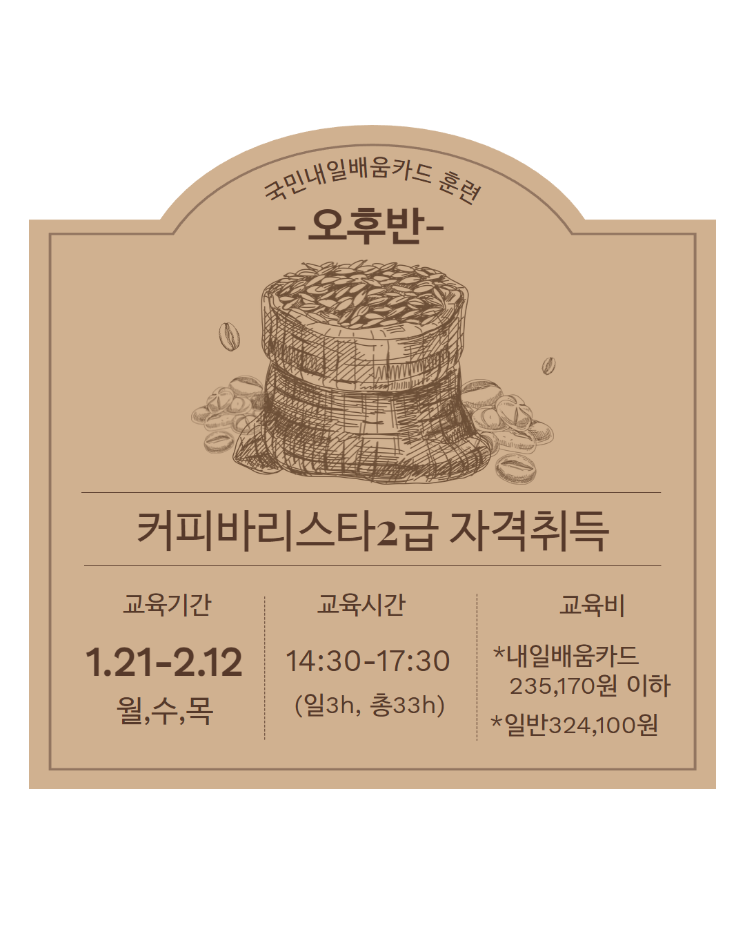 수강료324,100원(재료비 포함)/ 내일배움카드 70,000-209,760원 / 자격응시료 별도 있음